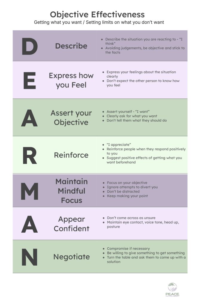 DEAR MAN is a core interpersonal effectiveness skill from Dialectical Behaviour Therapy. It’s used to help you ask for what you want, say no, or assert your needs clearly – without damaging the relationship or your self-respect.