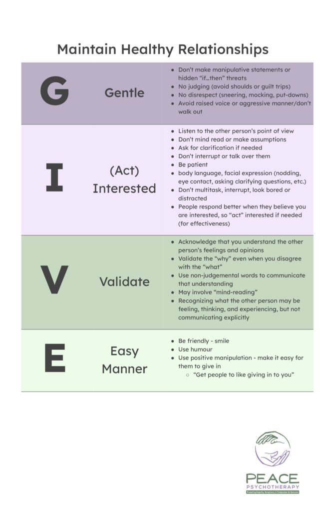 GIVE is an interpersonal effectiveness skill from Dialectical Behaviour Therapy that helps you maintain and strengthen relationships during interactions. It stands for being Gentle, acting Interested, Validating the other person, and using an Easy manner. Using GIVE supports connection and respect, especially in conversations where conflict or tension is present.